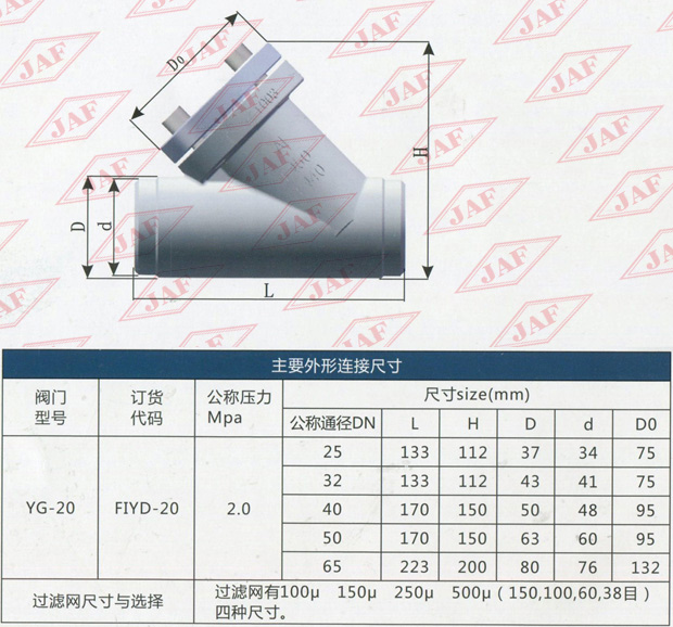 FI表示過濾器 Y表示結構形式為直流式 D表示對焊連接 20代表公稱壓力為2.OMPa 20后不標注表示殼體材質(zhì)為鍛鋼。