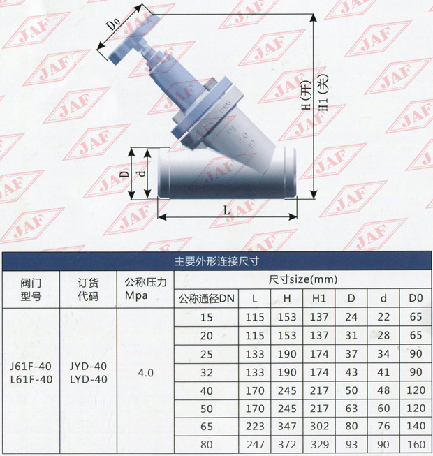 適用范圍 適用于公稱壓力為4.0M Pa、公稱通徑為DN15---DN65閥體材料為鍛鋼的對焊直流截止閥和節(jié)流閥?! ¢y門屬性 公稱壓力為4.0MPa,試驗壓力為6.0MPa,適用溫度為-50°C-+200°C適用介質(zhì)為氨、氟等?! 表示截止閥 A表示結(jié)構(gòu)形式為直角式 D表示對焊連接 40代表公稱壓力為4.0MPa 40后不標(biāo)注表示閥體材質(zhì)為鍛鋼。